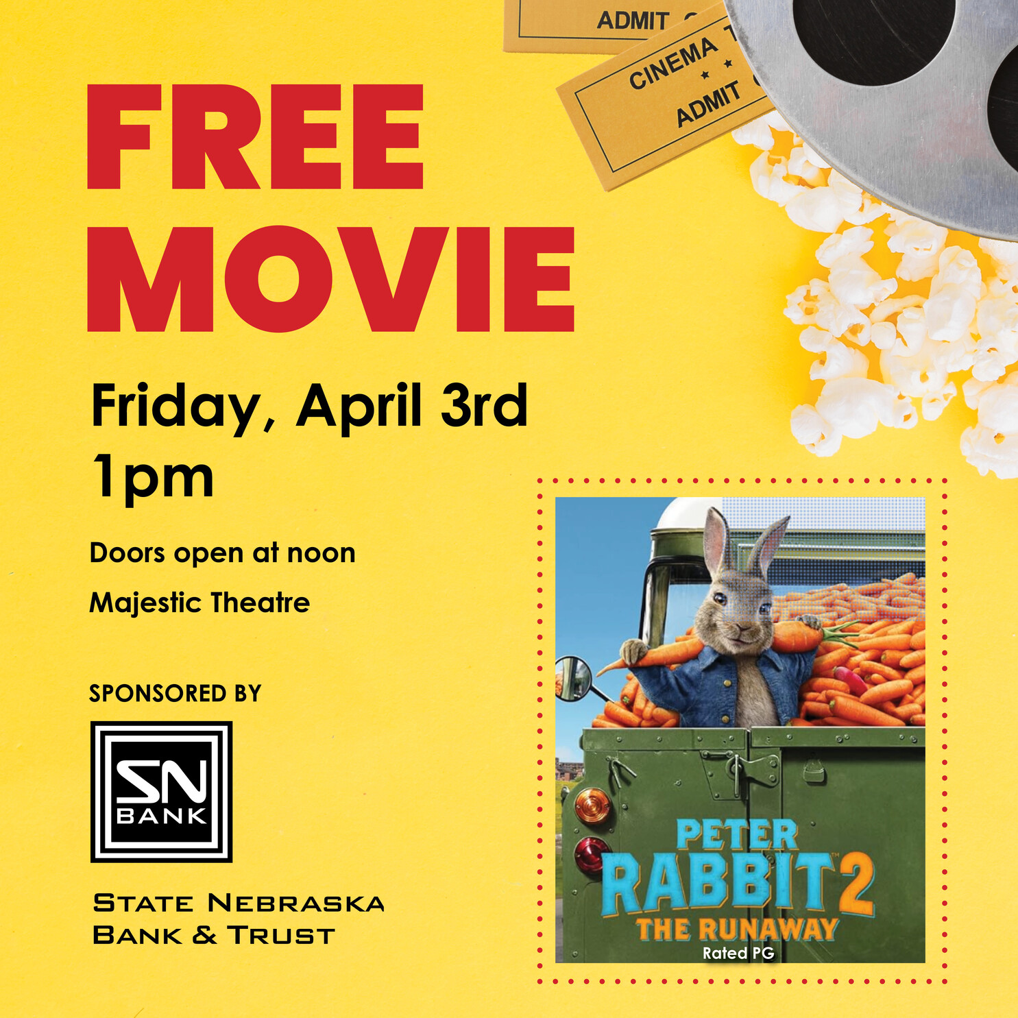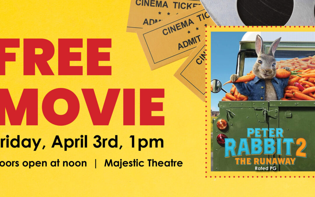 March 30, 2026 – Hop over to the Majestic Theatre in Wayne on Friday, April 3, to see Peter Rabbit 2 for free. State Nebraska Bank & Trust is sponsoring the PG-rated movie for free to the public. Kids, families, and adults will enjoy this live-action comedy. Doors open at noon and the movie starts at 1pm at the Majestic Theatre in Wayne, Friday, April 3rd. Bring your own cup or popcorn container for $1 off concessions.