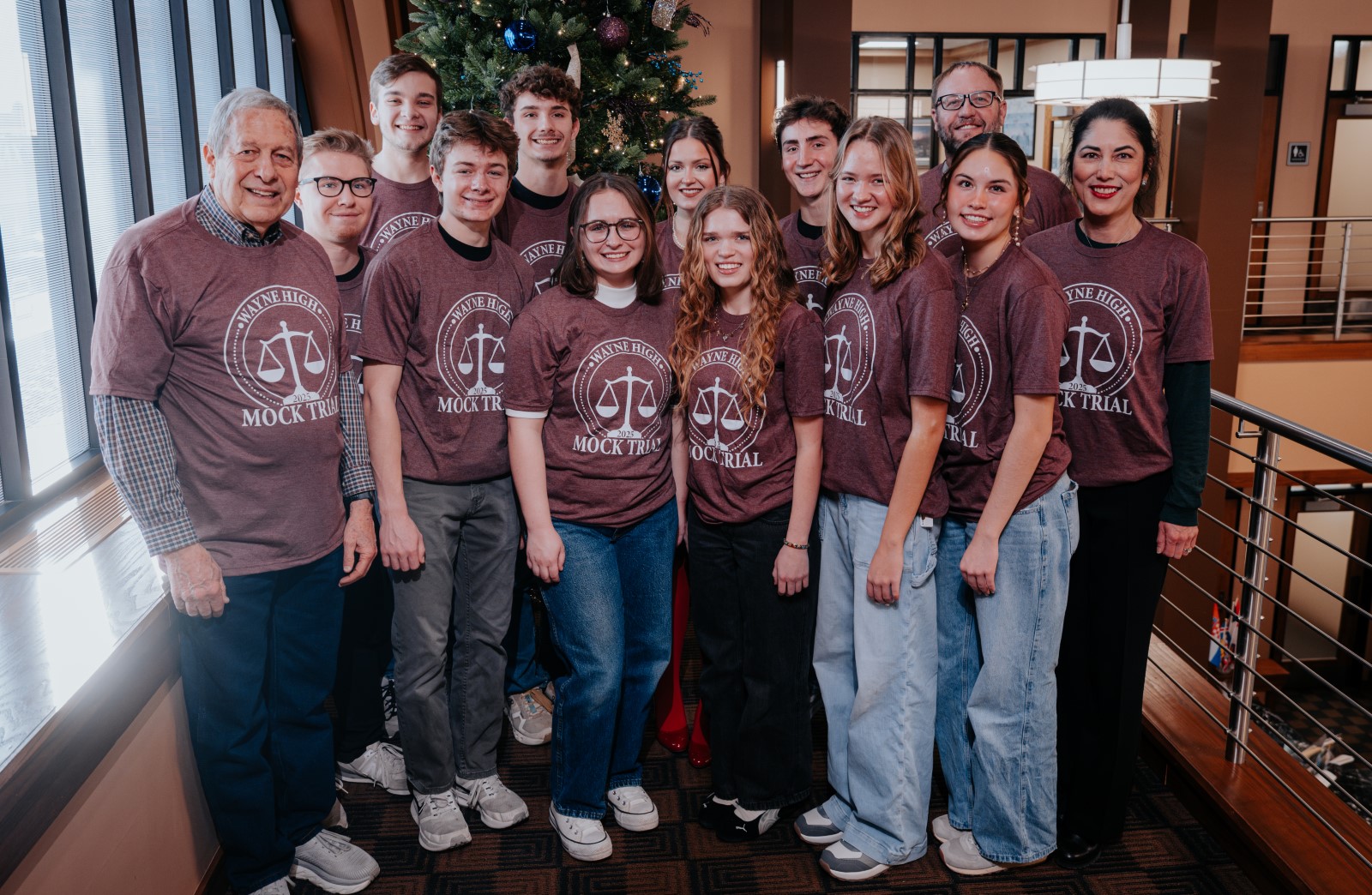 January 7, 2026 – State Nebraska Bank & Trust celebrated the Wayne High Mock Trial team for its Runner Up place across all classes in the state competition last month, the highest ever for a Wayne team. State Nebraska Bank & Trust is a super fan of this team, with two bank kids on it, Josie Ley and Colby Raulston, and our own Sandy Brown as a coach. The bank treated the team and its coaches to state shirts made by Total Graphics, then grabbed some fun pics at the bank’s holiday chamber coffee held December 19th. Congrats again to these talented Wayne High students!